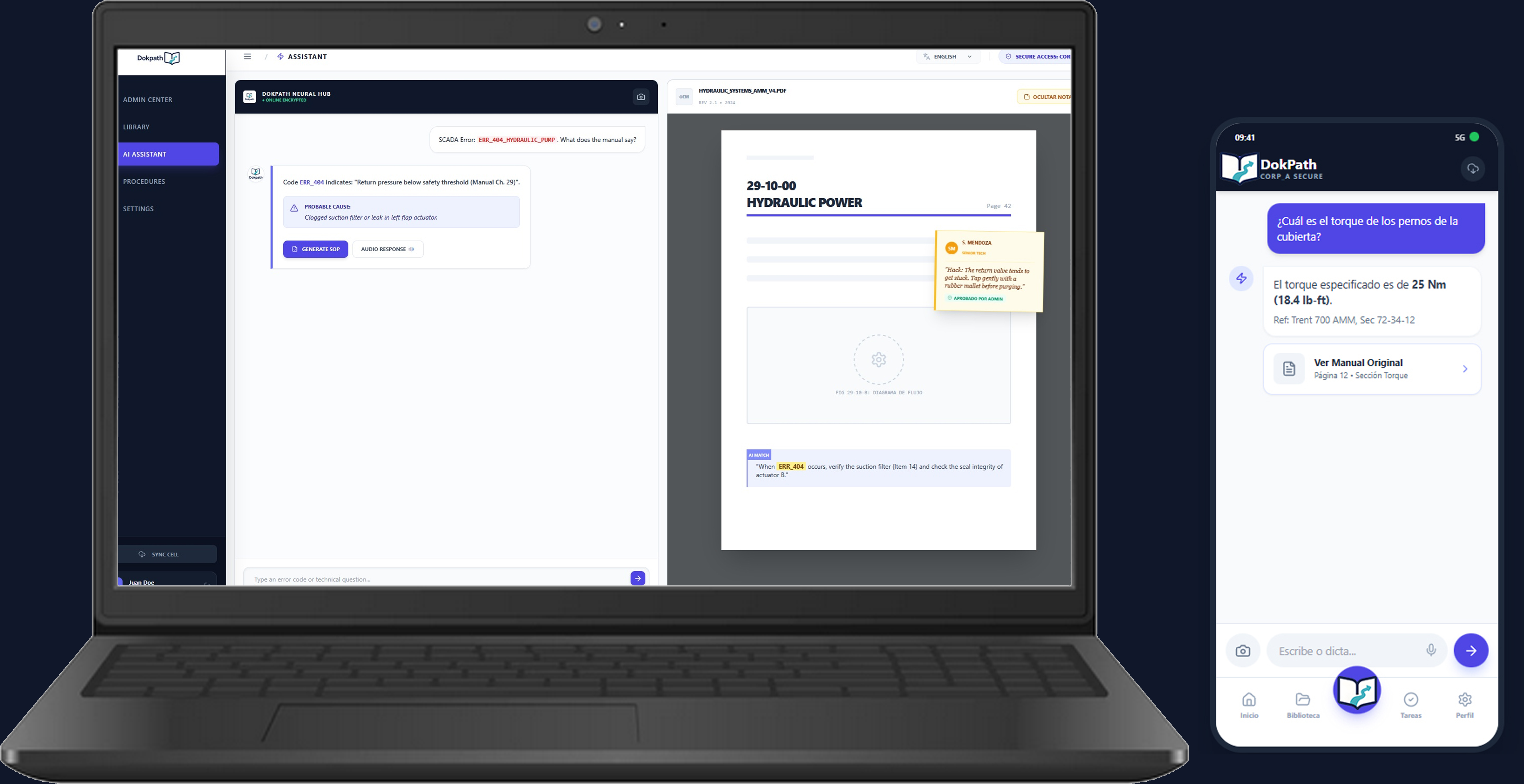 DokPath transforms your OEM manuals into a verified, source-cited field assistant — online or offline, in five languages. Every answer includes the exact page. Every action generates an audit trail. Built for EASA NPA 2025-07 from day one.